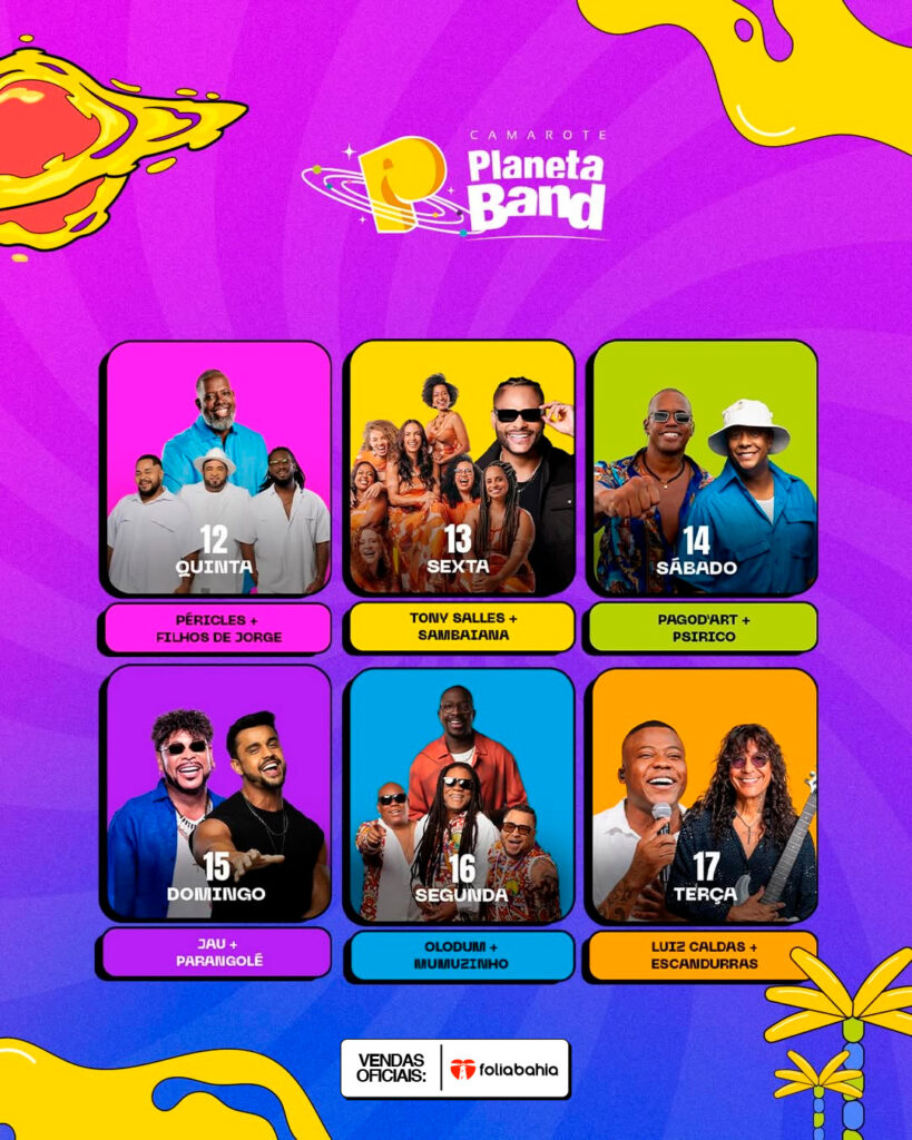 Para complementar toda essa estrutura, o Camarote Planeta Band investe em uma curadoria musical animada, reunindo artistas consagrados que representam a essência do Carnaval da Bahia. O line-up foi cuidadosamente pensado para manter a energia lá em cima durante todos os dias da festa, com shows que misturam samba, pagode e música baiana.